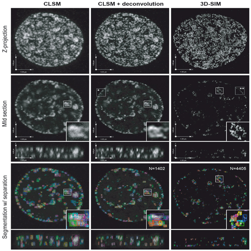 DNA replication, similar to other cellular processes, occurs within dynamic macromolecular structures. Any comprehensive understanding ultimately requires quantitative data to establish and test models of genome duplication. We used two different super-resolution light microscopy techniques to directly measure and compare the size and numbers of replication foci in mammalian cells. This analysis showed that replication foci vary in size from 210nm down to 40 nm. Remarkably, spatially modulated illumination (SMI) and 3Dstructured illumination microscopy (3D-SIM) both showed an average size of 125nm that was conserved throughout S-phase and independent of the labeling method, suggesting a basic unit of genome duplication. Interestingly, the improved optical 3D resolution identified 3- to 5-fold more distinct replication foci than previously reported. These results show that optical nanoscopy techniques enable accurate measurements of cellular structures at a level previously achieved only by electron microscopy and highlight the possibility of high-throughput, multispectral 3D analyses.