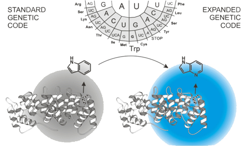 Our long-term goal is the in vivo expression of intrinsically colored proteins without the need for further posttranslational modification or chemical functionalization by externally added reagents. Biocompatible (Aza)Indoles (Inds)/(Aza)Tryptophans (Trp) as optical probes represent almost ideal isosteric substitutes for natural Trp in cellular proteins. To overcome the limits of the traditionally used (7-Aza)Ind/(7-Aza)Trp, we substituted the single Trp residue in human annexin A5 (anxA5) by (4-Aza)Trp and (5-Aza)Trp in Trp-auxotrophic Escherichia coli cells. Both cells and proteins with these fluorophores possess intrinsic blue fluorescence detectable on routine UV irradiations. We identified (4-Aza)Ind as a superior optical probe due to its pronounced Stokes shift of 130 nm, its significantly higher quantum yield (QY) in aqueous buffers and its enhanced quenching resistance. Intracellular metabolic transformation of (4-Aza)Ind into (4-Aza)Trp coupled with high yield incorporation into proteins is the most straightforward method for the conversion of naturally colorless proteins and cells into their blue counterparts from amino acid precursors.