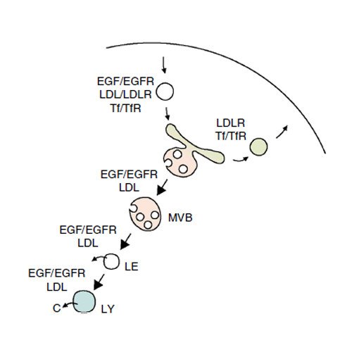 Endolysosomal organelles play a key role in trafficking, breakdown and receptor-mediated recycling of different macromolecules such as low-density lipoprotein (LDL)-cholesterol, epithelial growth factor (EGF) or transferrin. Here we examine the role of two-pore channel (TPC) 2, an endolysosomal cation channel, in these processes. Embryonic mouse fibroblasts and hepatocytes lacking TPC2 display a profound impairment of LDL-cholesterol and EGF/EGF-receptor trafficking. Mechanistically, both defects can be attributed to a dysfunction of the endolysosomal degradation pathway most likely on the level of late endosome to lysosome fusion. Importantly, endolysosomal acidification or lysosomal enzyme function are normal in TPC2-deficient cells. TPC2-deficient mice are highly susceptible to hepatic cholesterol overload and liver damage consistent with non-alcoholic fatty liver hepatitis. These findings indicate reduced metabolic reserve of hepatic cholesterol handling. Our results suggest that TPC2 plays a crucial role in trafficking in the endolysosomal degradation pathway and, thus, is potentially involved in the homoeostatic control of many macromolecules and cell metabolites.